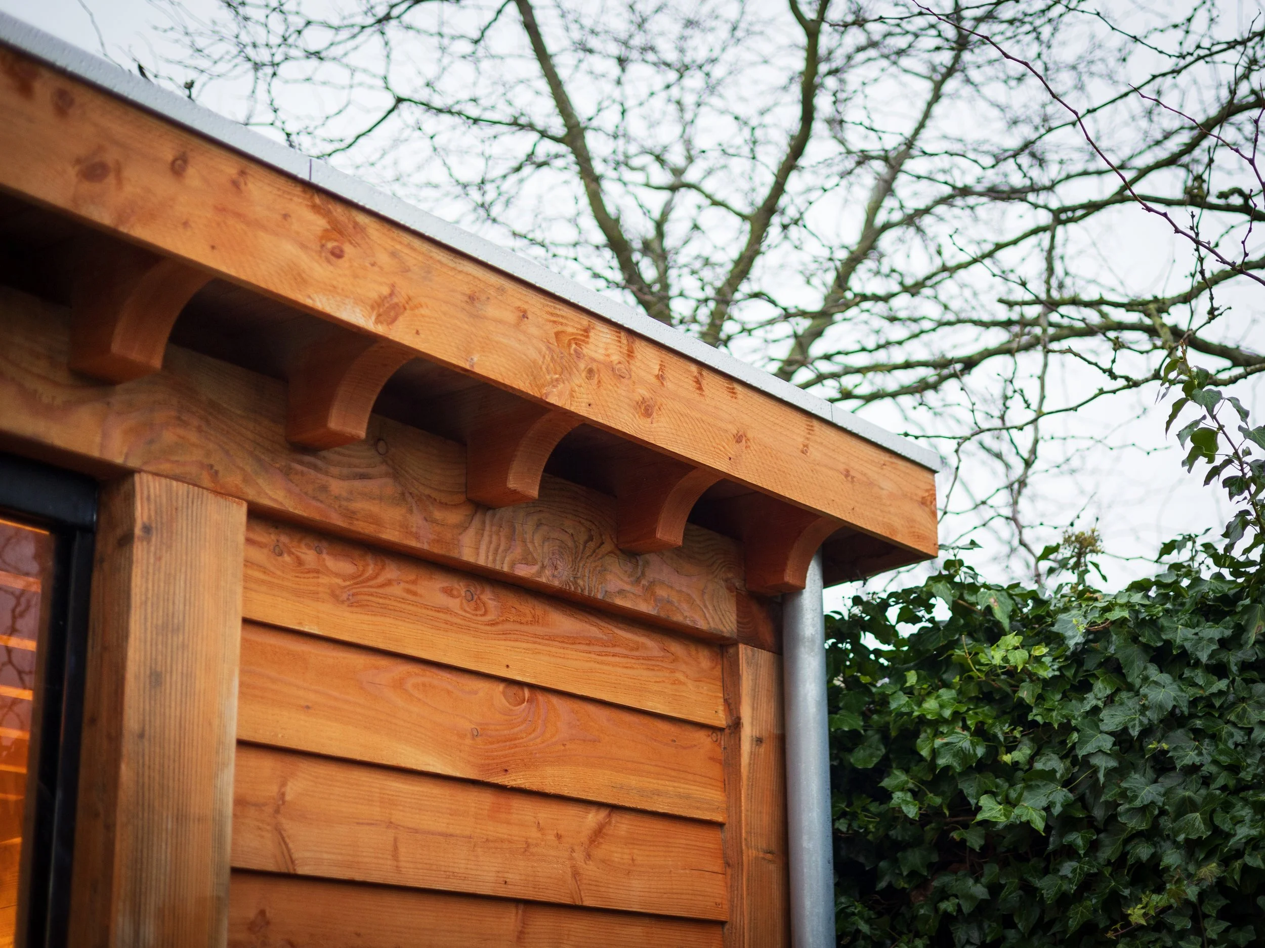 Een van de hoogtepunten van deze overkapping zijn de afgeronde klossen in de overstek die een speels en toch elegant tintje toevoegen aan het ontwerp.