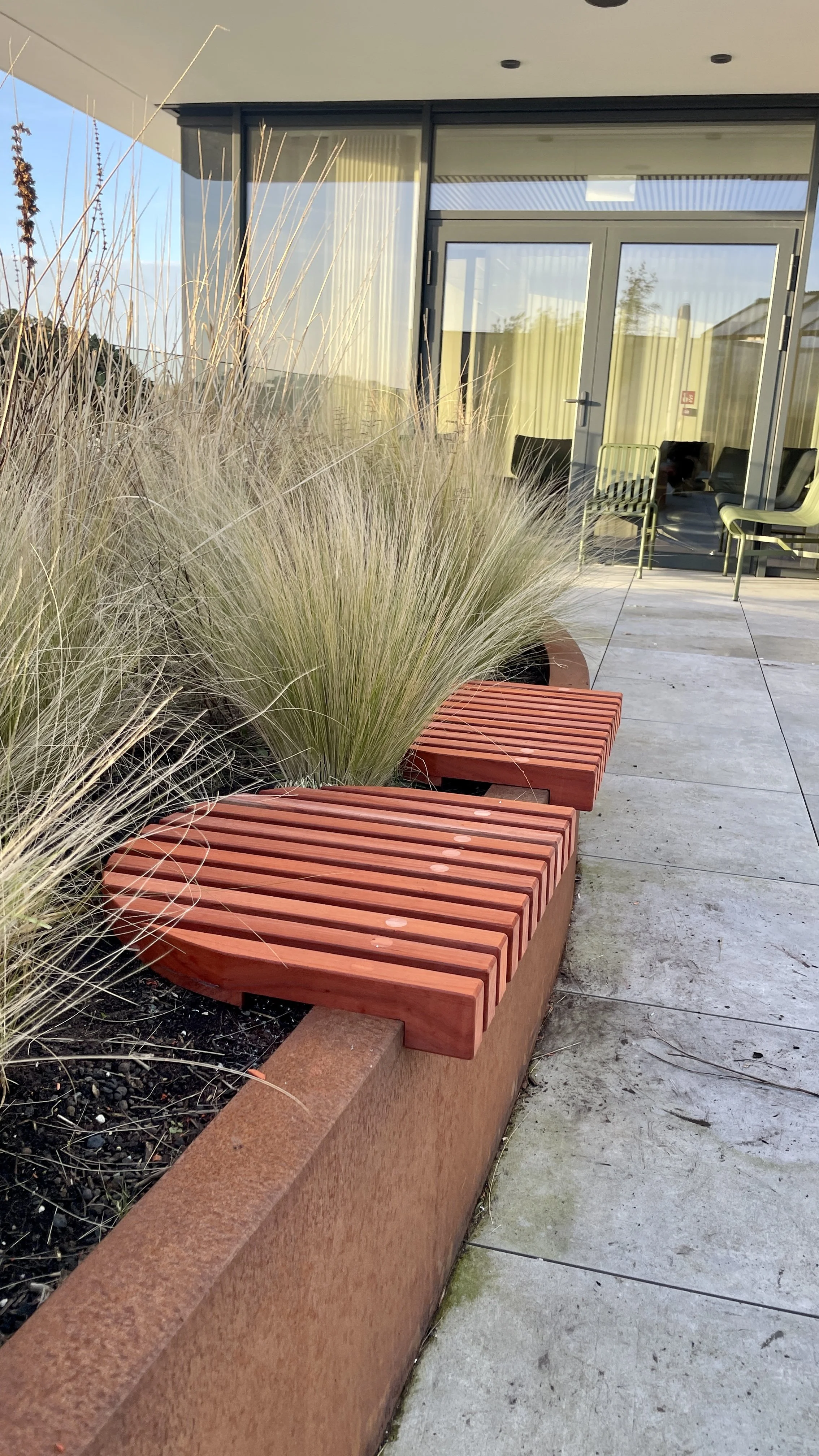 De keuze voor de houtsoort was snel gemaakt. Padouk werd het, een uitstekende keuze voor buitengebruik. In combinatie met cortenstaal vakregen we een stoere look. Tijdens de verwerking en de eerste weken heeft padouk een opvallende rode kleur, wat een bijzondere uitstraling geeft. Na enkele weken neemt deze kleur af en maakt plaats voor een rustige grijze kleur.